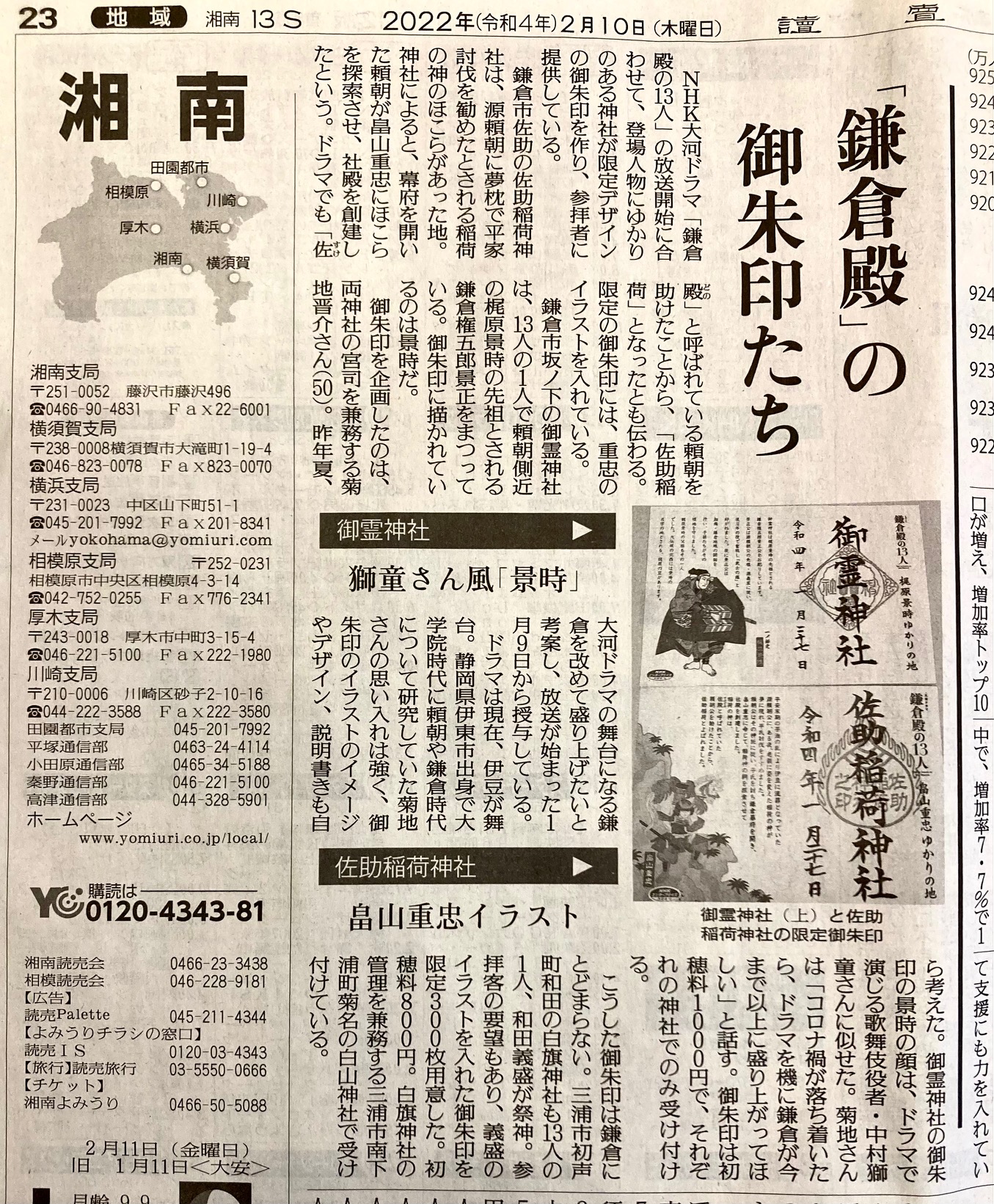 読売新聞に当店で彫刻させて頂いた御霊神社様・佐助稲荷様の御朱印について掲載されました。