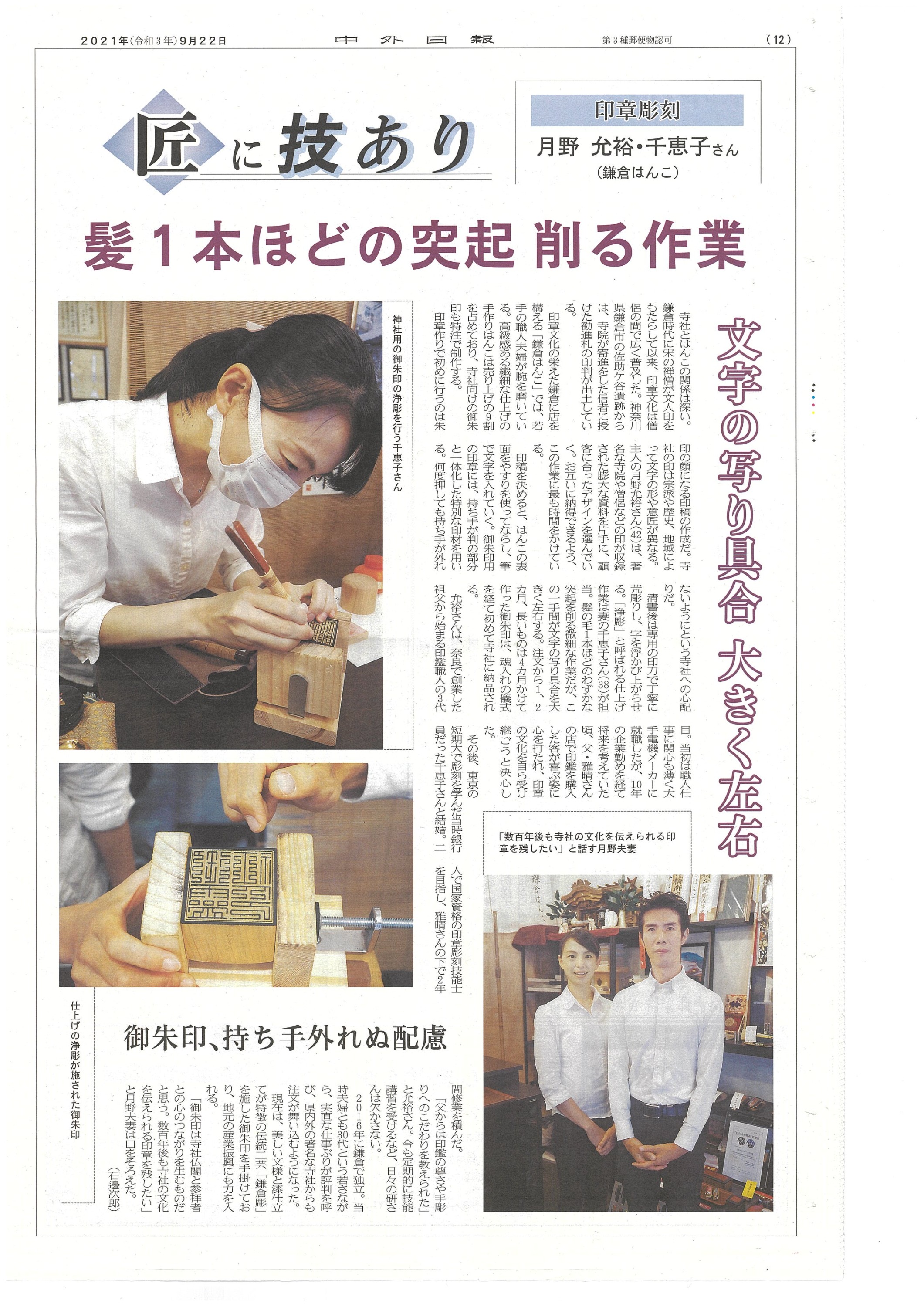 神奈川新聞に鎌倉彫御朱印の記事が掲載されました。